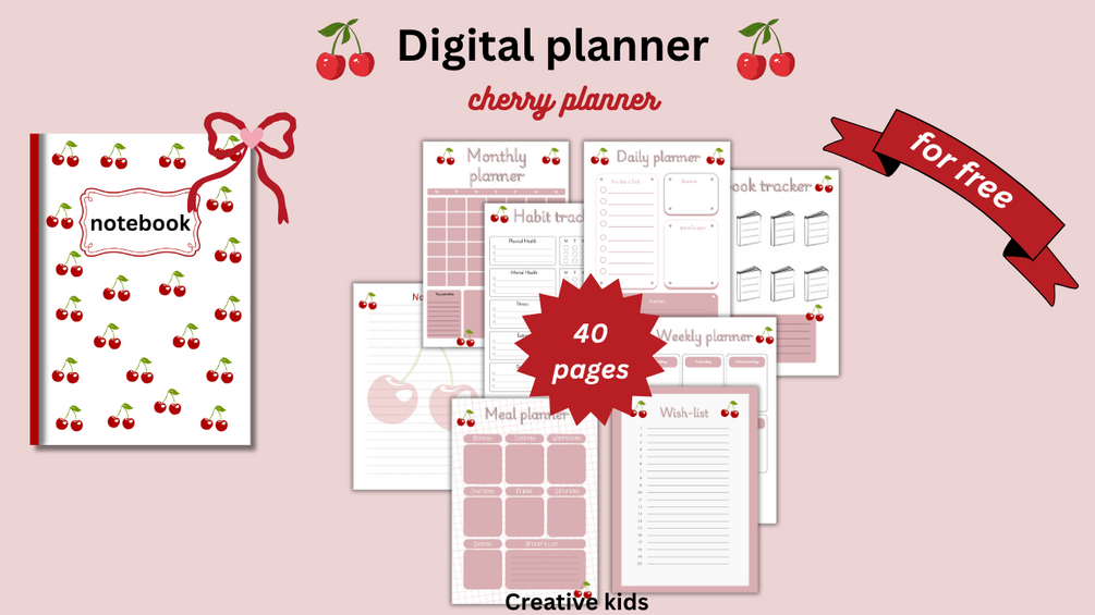 Stay organized in style with this charming digital planner adorned with delicate cherry illustrations. The soft and feminine design features vibrant cherry motifs on a gentle background, adding a fresh, playful touch to every page.